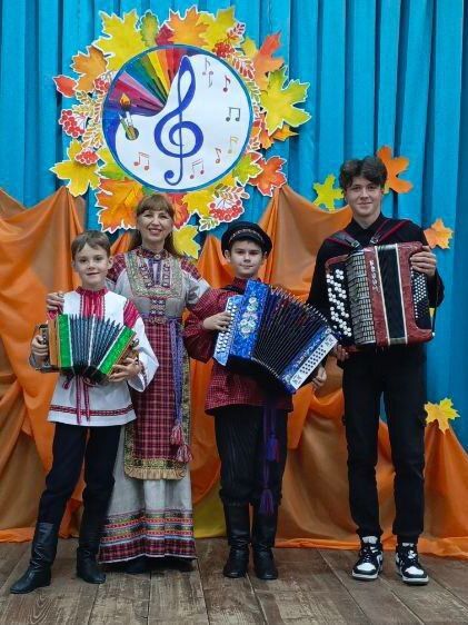 со своими учениками Левиной А., Седовой У., Ивановым В., Константиновым В., Бодаревым Е. и Арсеньевым В. для старшеклассников СОШ № 2 и СОШ № 1 провели мероприятие "Играй, гармонь любимая!". Цель мероприятия - пропаганда и возрождение интереса у школьников к народному инструменту - гармони.В первой части программы ведущие рассказали об истории появления гармошки в России, о том, как гармонисты поднимали дух советских бойцов в годы Великой Отечественной войны. Учащиеся фольклорного отделения показали красоту пения под гармонь. Во второй части все гости мероприятия проявили свои музыкальные и танцевальные способности, приняли участие в народных играх, в которые много лет назад играли на Руси. Шумные, задорные и очень дружные забавы подарили всем отличное настроение и возможность по-настоящему сплотиться. В заключение мероприятия все дружно под гармонь спели известную песню "Катюша".