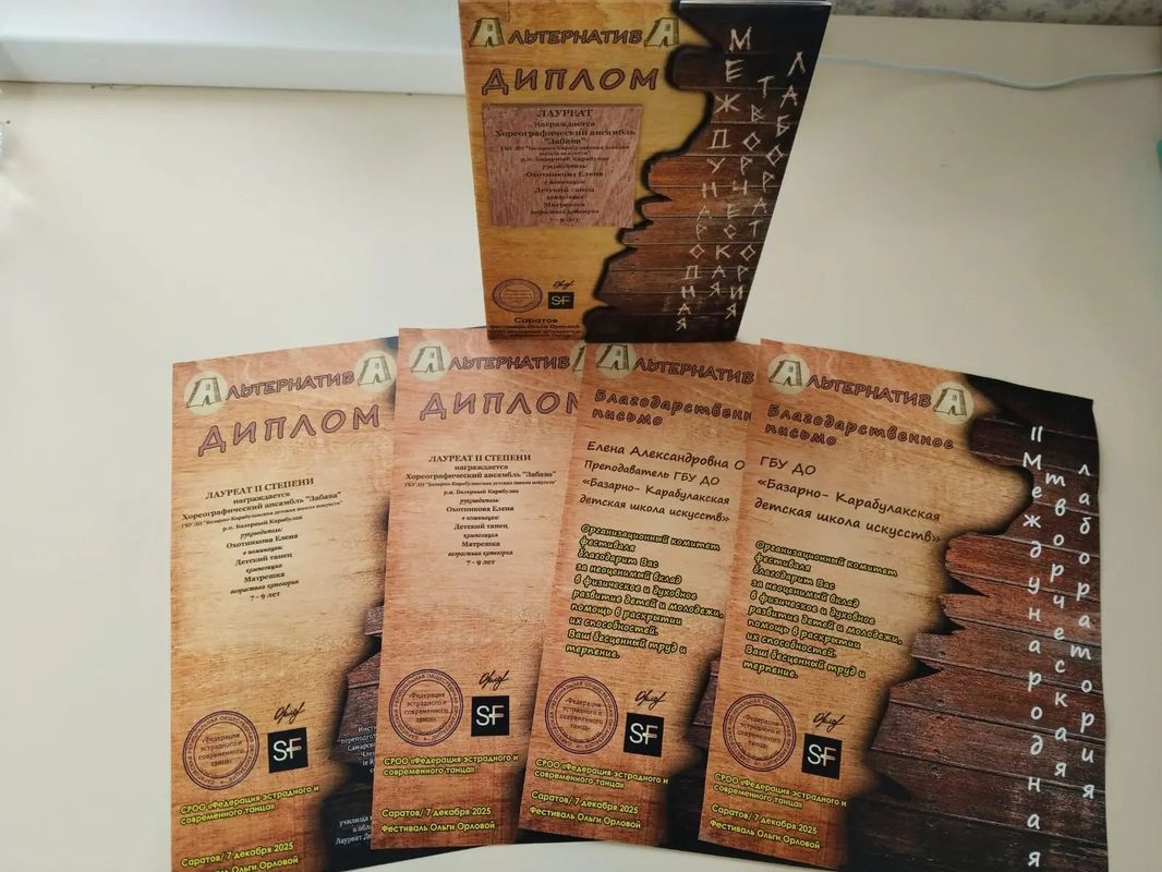 7 декабря коллектив выступил на двух конкурсах в Саратове. Результаты: Ввсероссийский конкурс "Детки конфетки"- Лаурет I степени. Международный конкурс "Альтернатива"-Лауреат II степени. Оба диплома ансамбль завоевал с ярким номером "Матрешка". Поздравляем юных артистов и их руководителя Охотникову Е.А.,благодарим родителей за помощь в организации поездки. Желаем коллективу новых творческих побед!