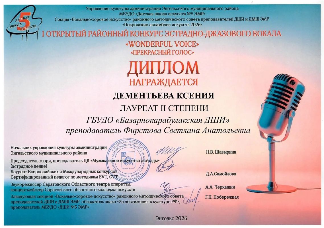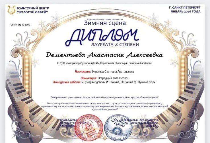 Мероприятие собрало много талантливых исполнителей из образовательных учреждений Энгельсского муниципального района, города Саратова и всей Саратовской области. Приняли участие и учащиеся Б - Карабулакской ДШИ Анастасия и Ксения Дементьевы, им были присвоены дипломы лауреатов. За участие во Всероссийском конкурсе "Зимняя сцена" они так же награждены дипломами лауреатов. Поздравляем девочек с успешными выступлениями и желаем дальнейших успехов!