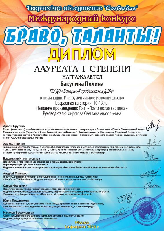 В Международном конкурсе "Браво таланты" в номинации: "Инструментальное исполнительство" (фортепиано) учащаяся Б -Карабулакской ДШИ Бакулина Полина получила диплом лауреата. Поздравляем с победой и желаем дальнейших творческих достижений!