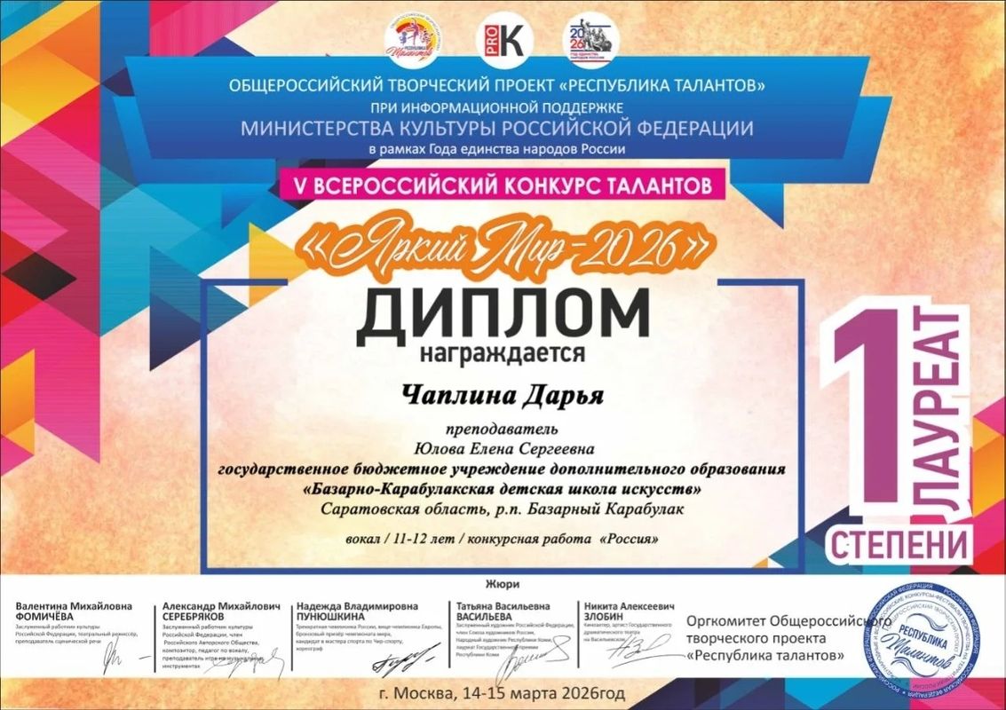 С волнением и гордостью делимся замечательной новостью о победе юной вокалистки во Всероссийском онлайн - конкурсе талантов "Яркий мир - 2026", который был организован в г. Москве 14 - 15 марта 2026 г.